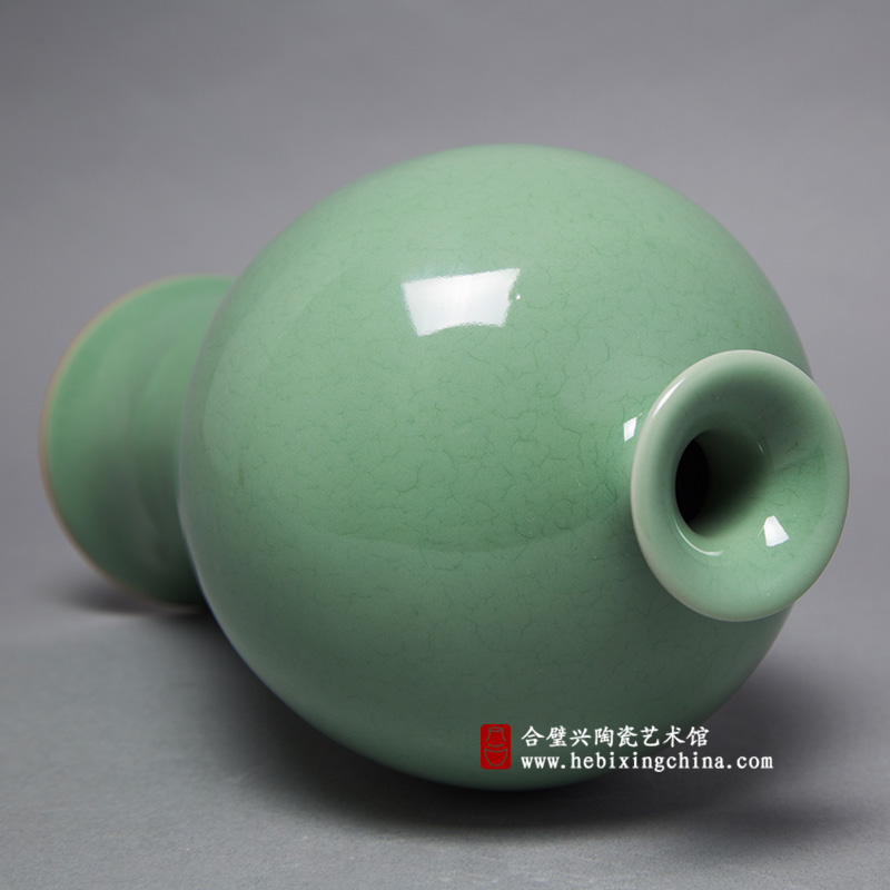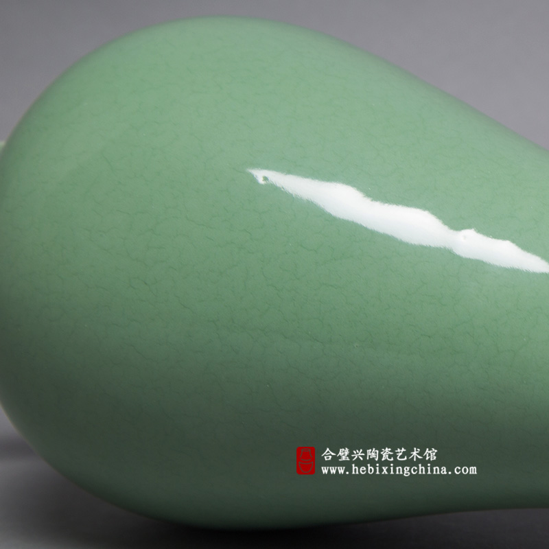 丰厚的釉质在流动间形成的纹路遍布整个瓶身,在可人的青色里泛着隐隐的柔光,如同上好青色丝缎上流动的暗纹,精美而典雅,配上丰肩细腰的玲珑造型,真是典雅中有灵动,丰腴中见俏皮。