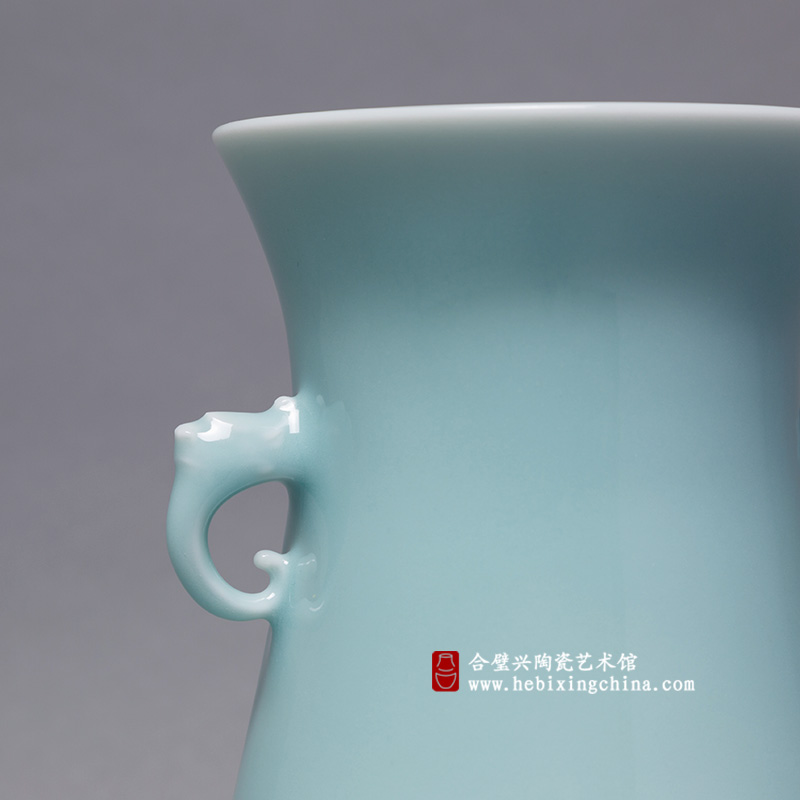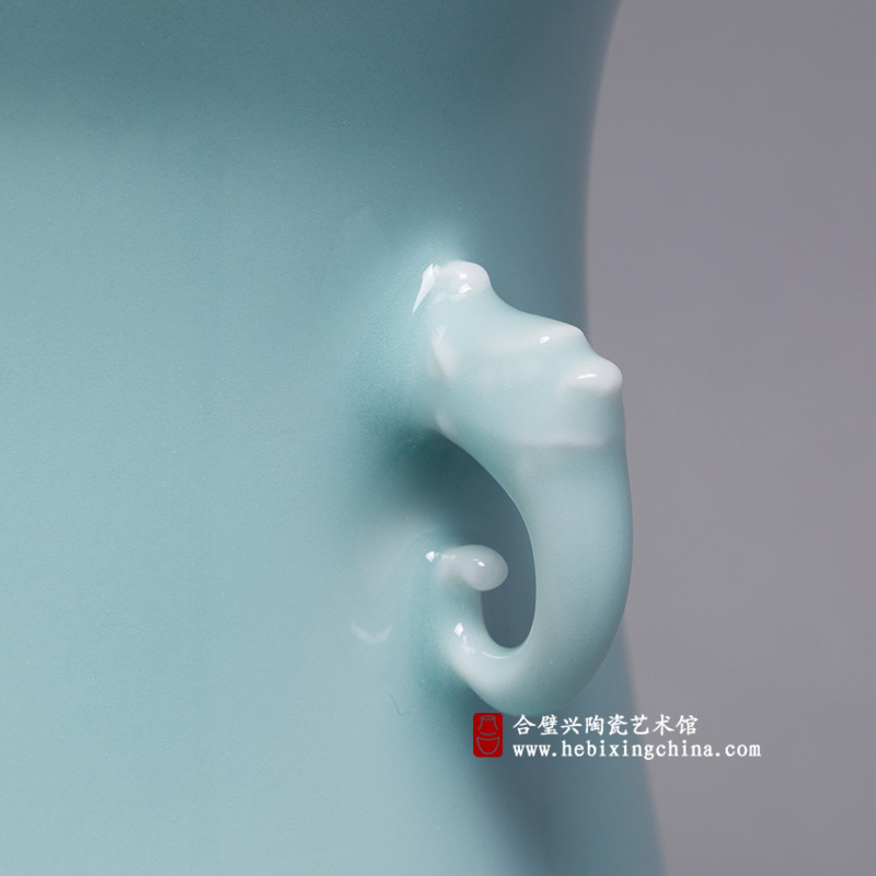 简练的线条勾勒出优美大气的瓶身,一对玲珑精致的龙形瓶耳,在明朗的釉色中化身两条玉色的小龙遨游天际,既充满了个性也点出了作品的主题。