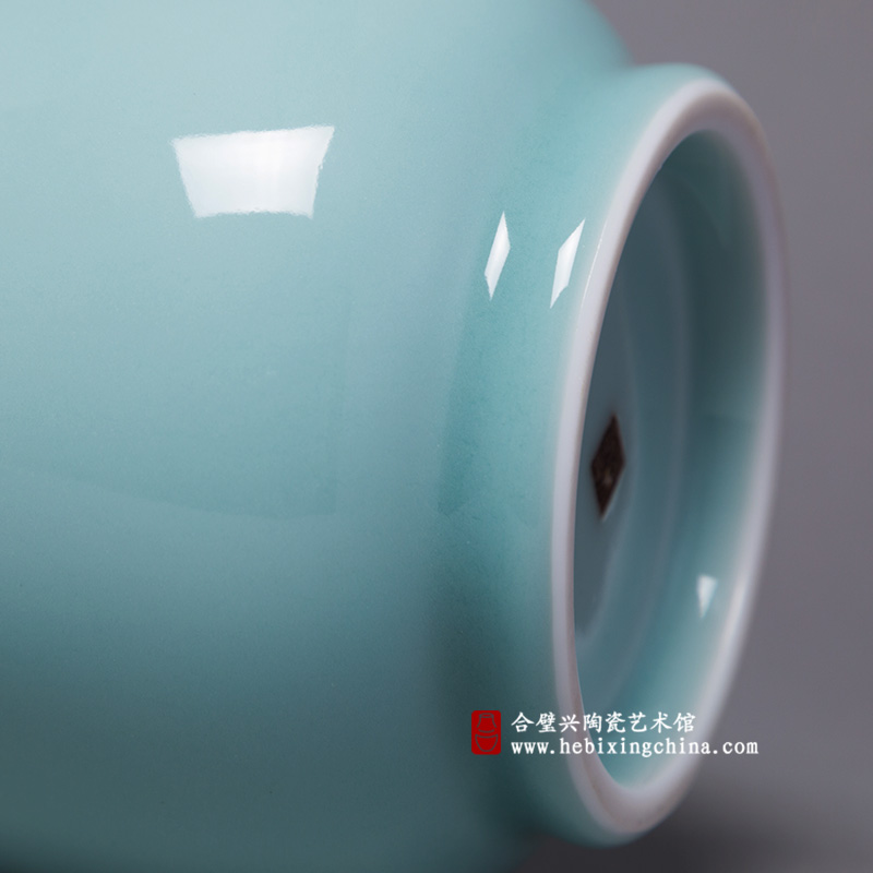 徐定昌老师的粉青釉总是给人皎洁纯净的感觉,在纯白的胎体上更显得自然而清新,仿佛是来自天际的清风,又如天山之巅的纯净冰凌,用沁人心脾的纯美诠释着龙泉青瓷“如冰似玉”的质感之美。