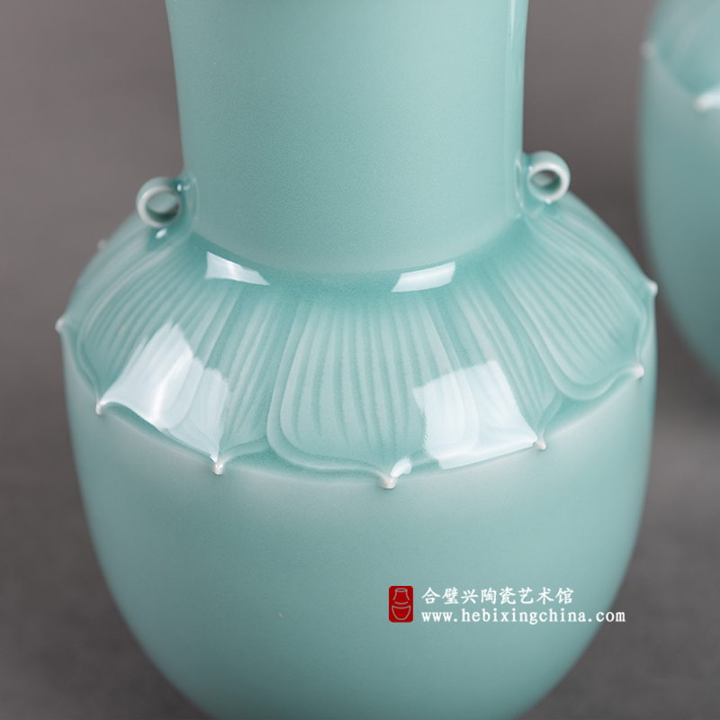颈肩转折处两只玲珑的环形小耳分外可爱。肩部莲瓣装饰脉络分明,尖端微微翘出,俏丽精致。颈部与腹部线条简洁,舒展自然。