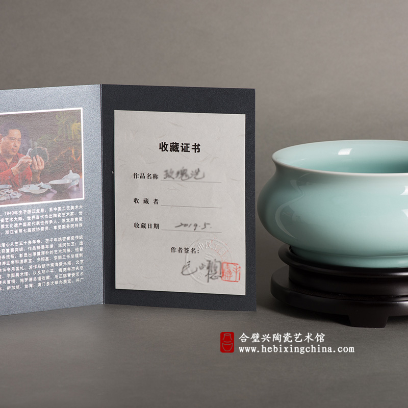 毛正聪从事青瓷艺术研究60多年,作品在继承传统工艺基础上大胆创新,造型简洁大方、典雅大气、釉层丰满,温润如玉。哥窑象形开片千奇百态,既象非象,别具一格,创当代青瓷最高境界。作为越系青瓷技艺史海钩沉的大家,毛正聪大师已致力恢复了仿官釉、鱼籽纹等多项失传技艺,为中国陶瓷事业继往开来做出了卓越贡献。