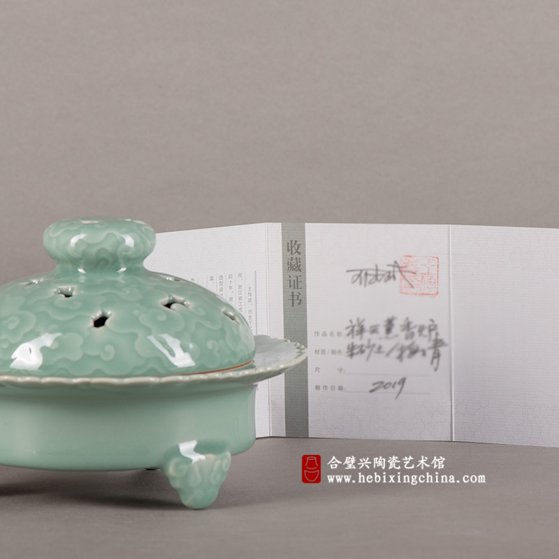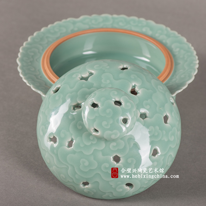每当焚香时,香烟自烟孔中袅袅而出,缭绕在熏炉周围,与祥云纹样相映成趣,好像刻在炉身上的青色祥云也随着香烟涌动起来,仿佛是真的要引领着我们走入云蒸霞蔚的仙界去探寻那神秘的宝藏。