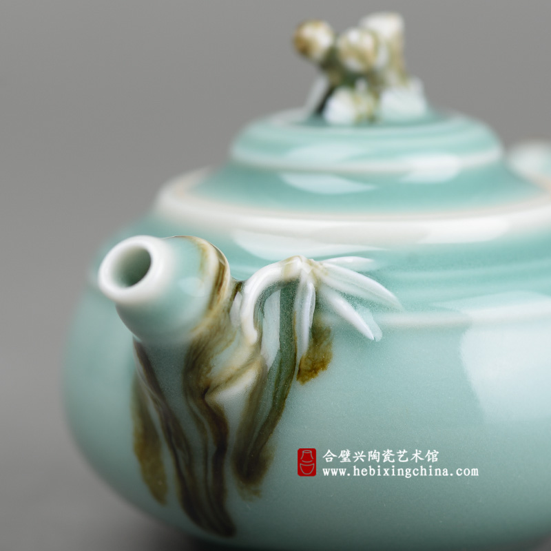 以竹节流,梅枝做把,颇有些紫砂壶的情致,再以饱满如玉珠的壶腹将两者相连,青翠丰腴的梅子青釉为瓷壶染上了翡翠玉雕般的光晕,盖钮做松枝状完整了岁寒三友的主题,精巧可爱的松针,静美灵动的白梅和飘逸潇洒的竹叶让瓷壶显得愈发可爱。