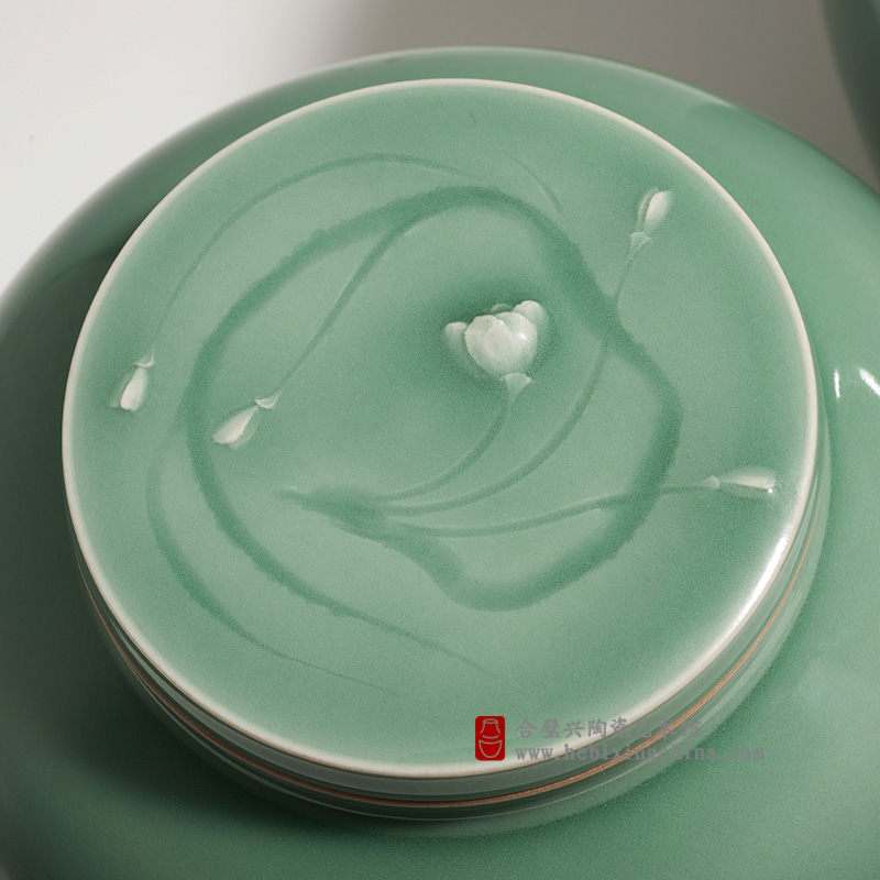 本件作品三个盖罐为一组,拉坯成型,器形饱满,瓶盖处满工装饰,施以龙泉传统粉青釉,釉色莹润透亮·有积釉·露胎等效果,更显整体感觉层次丰富。此件作品以层叠的花瓣,依偎的绿叶,装饰手法以浅浮雕为主,辅以局部的堆塑,视之叠而不乱,触之润而有型,茎叶,枝干以半刀泥的手法,略显随意率性,使之脉络若隐若现,主次分明,浑然天成,隐隐约约看见的花朵,像极了花朵倒映在西湖湖水中的影子。