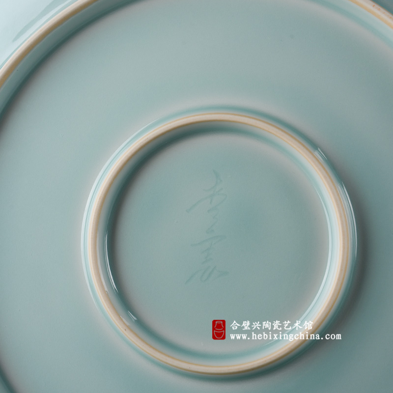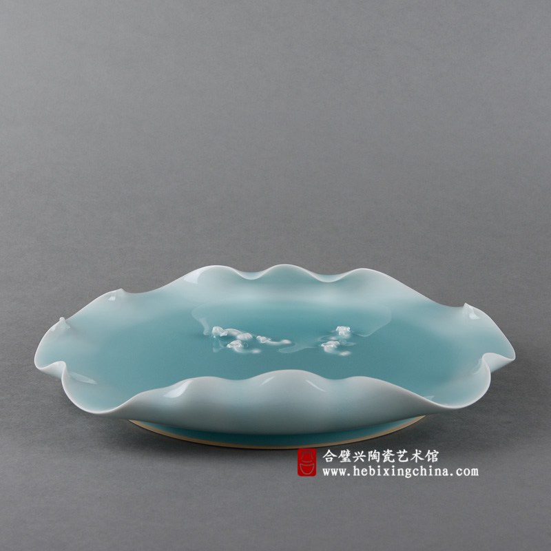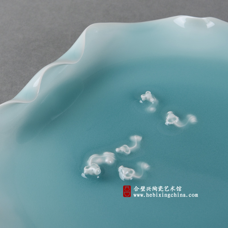 丰盈的翠青釉在巨大的荷叶上形成了细腻的积釉,光洁匀净的釉面像一面镜子,能照出清晰的倒影。