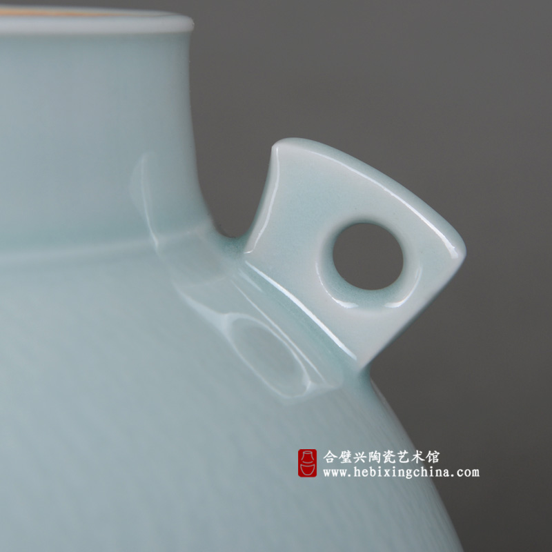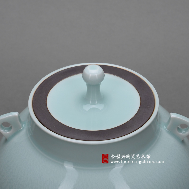 直颈,垂腹,圈足的规整器型因为别致的双耳和精巧盖钮而显出别样的灵动,细密的跳刀纹让清润的釉色也变得生气勃发。