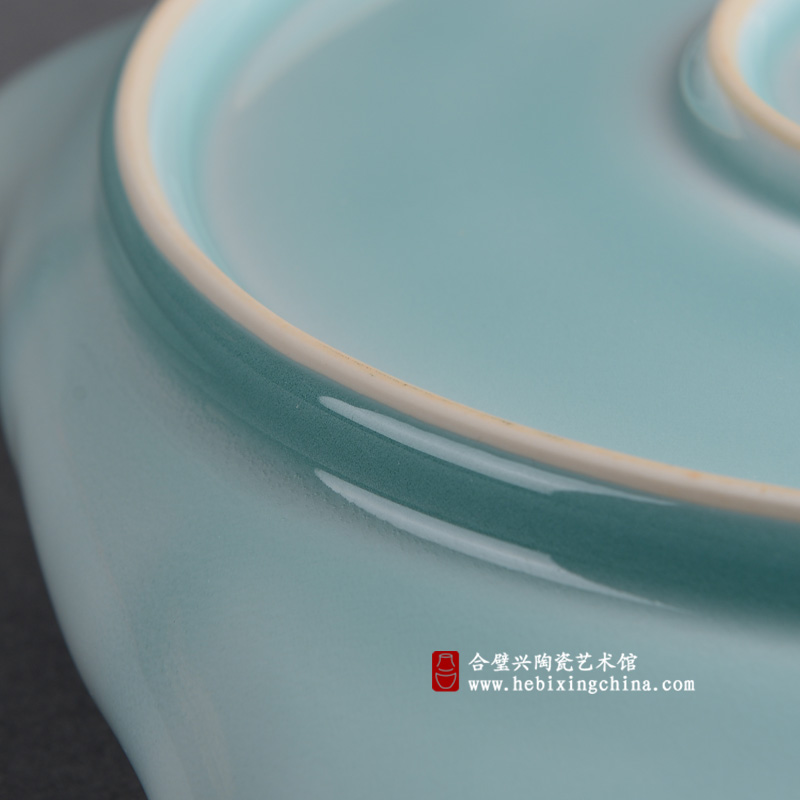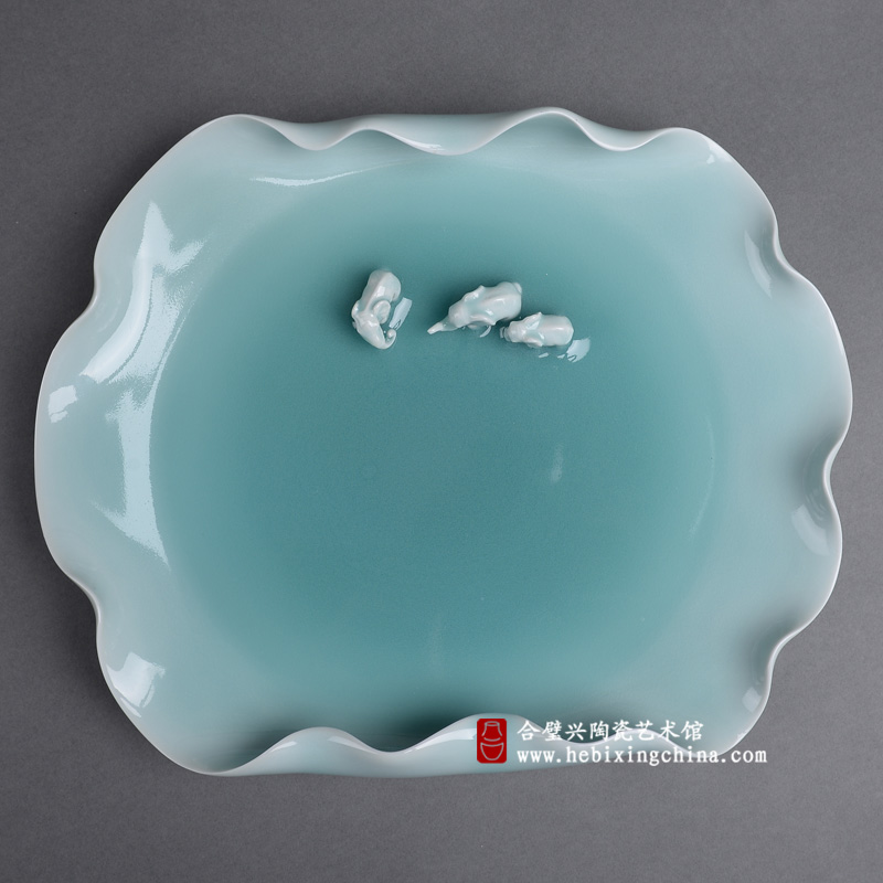 赴下身去荷叶边缘微微的卷曲把优美的倒影投射在釉面上,化作连绵的远山,将湖水、小象都围合在一方平和安宁的空间里,让人能静下心来细细品味这绝美的青色。