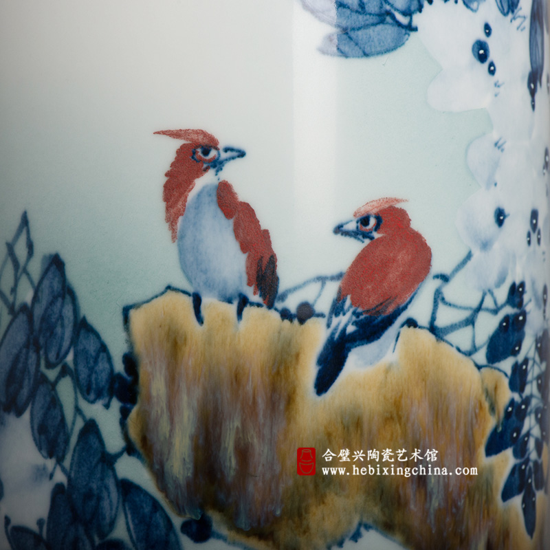 在这件作品中我们可以看到吴能老师对于青花、釉上彩和高温色釉三种工艺的深刻理解,青花发色清亮,釉上彩靓丽活泼,高温色釉细节丰富,三者共同将紫藤、小鸟、山石塑造的生动可爱。枝叶繁茂的紫藤贯穿整个画面,白色的花朵一团团一簇簇开得分外可人,两只羽毛艳丽的小鸟栖在藤萝半掩的山石上,似是在啾啾细语。
