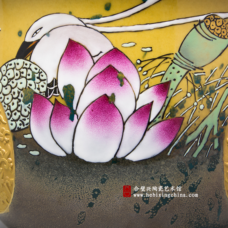 色彩鲜亮,形象略有夸张的莲花、莲蓬、鹭鸶带着鲜明的西洋装饰画风格,与阳刻的传统中式缠枝莲图案紧密嵌合,营造出一种兼容中西的独特装饰风格。