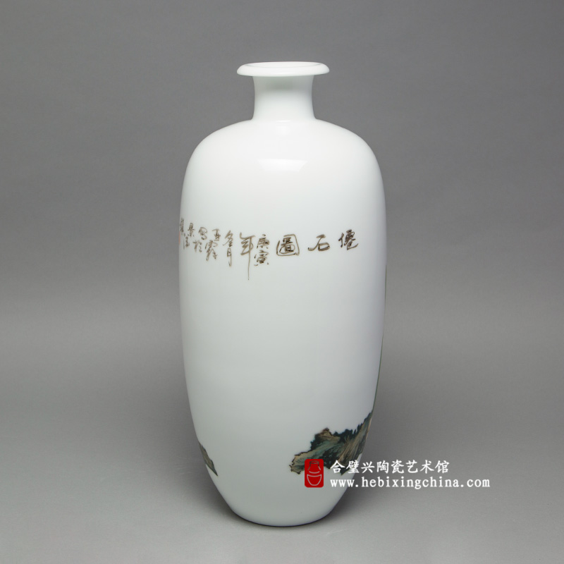 瓷瓶弧形的表面增加了画面的立体感,也增添了移步换景的情趣;莹白的胎体和光润的釉面则凸显出这组山石与水仙组合的清新脱俗。