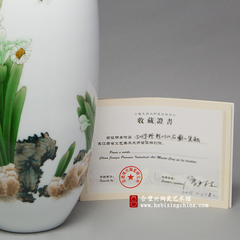 在这件作品中曾亚林将景德镇白瓷的瓷质之美与陶瓷绘画的工艺之美及装饰之美完美的融合在一处,展现出陶瓷艺术和谐自然的独特韵味。
