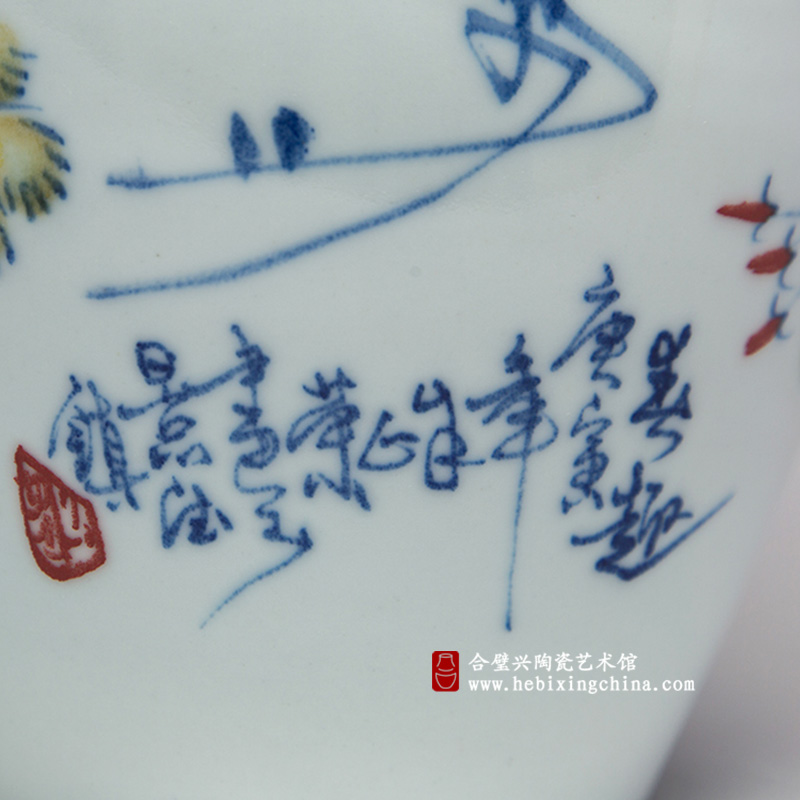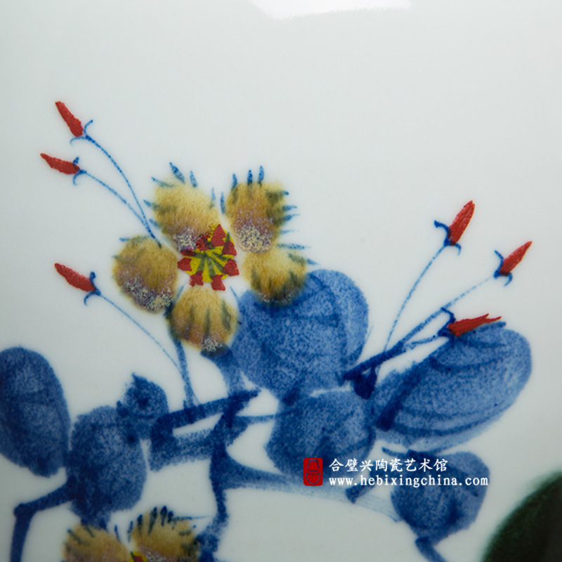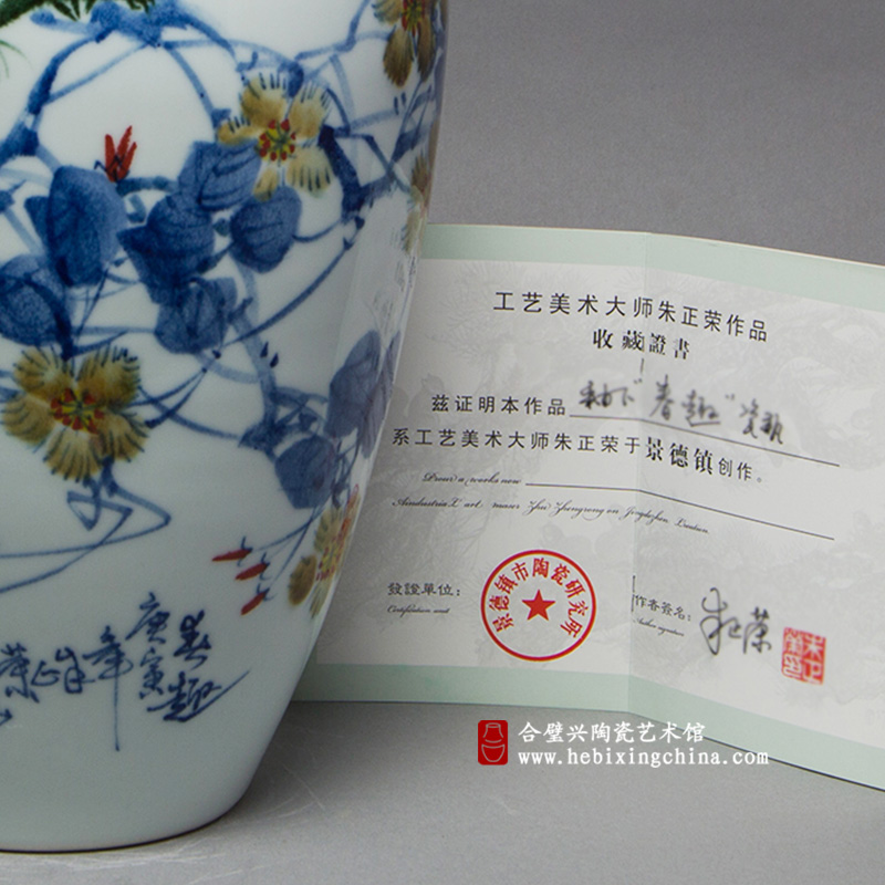 他以青花为藤,彩釉为花,将春光里的花藤描绘的格外动人,开满黄色花朵的藤蔓蜿蜒着铺满了整个画面,花朵红色的蕊珠在清晨的阳光里显得晶莹可爱。