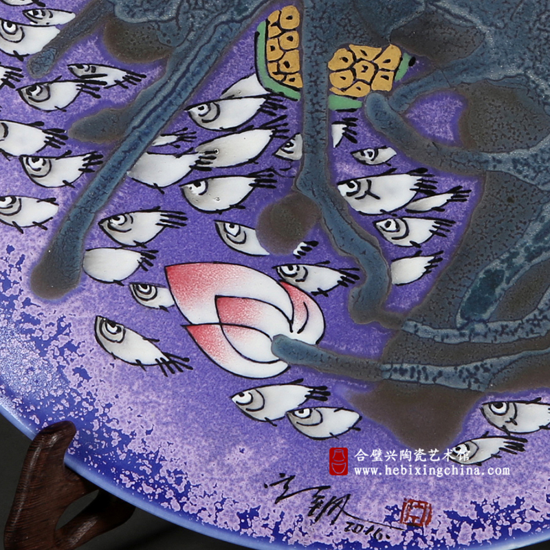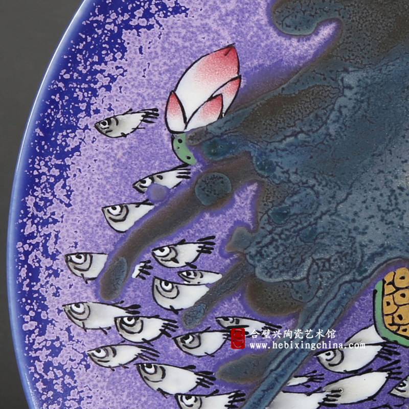 点点水花跳跃,倒映在池塘中的天空便又多了份灵动与清丽,挟裹着可爱的鱼儿缓缓向前。整件作品构图精巧,高温颜色釉色彩的呈现精准独到,画面十分立体可感。娇柔的荷花与饱满的莲藕自然地穿插于鱼群之间,画面密而不塞,疏而不空,生机盎然,律动感十足。