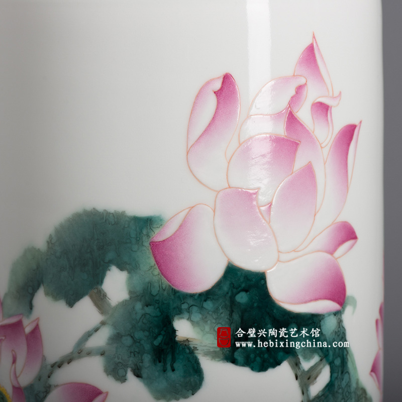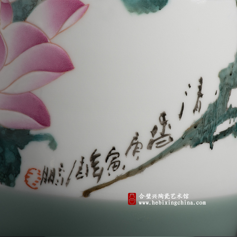 以清新艳丽的色彩在白色瓷胎上描画出五朵盛放的粉荷,浓郁的绿色颜料在粉荷之下泼洒出数片荷叶,泼洒形成的纹理,让浓绿的色彩产生了丰富的变化,将荷叶恣意舒展的姿态生动的呈现在我们眼前。