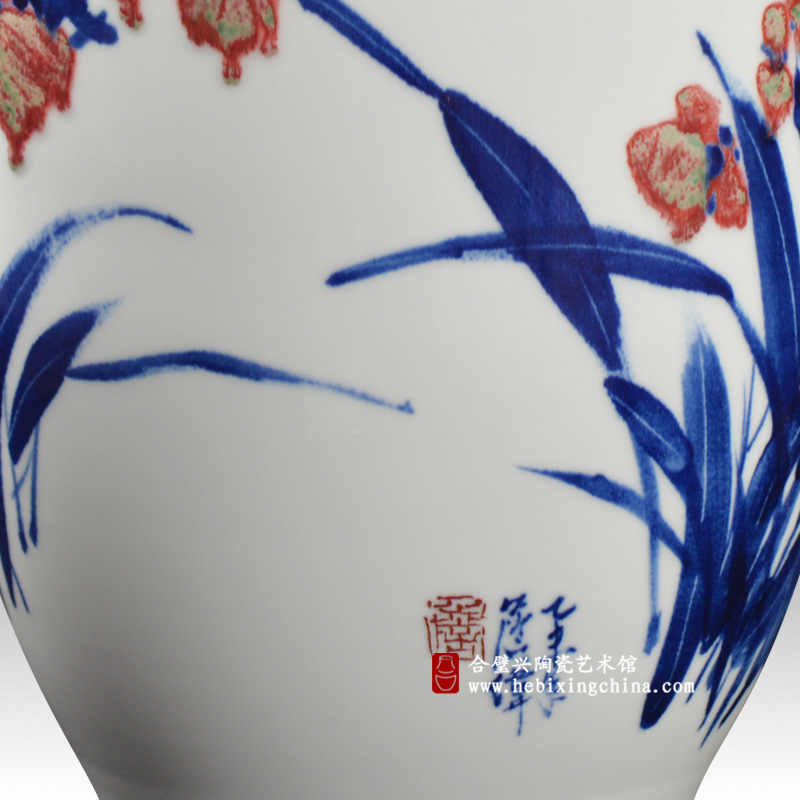 青花釉里红把娇美俊逸的兰花描绘出了不一样的风情——鲜艳热烈而洒脱优雅。以典雅的青花为叶,深水中水浅水的色彩变化把兰花茎叶的姿态描绘的活泼灵动,仿佛随着春风优雅的微微摆动。釉里红中闪出的点点翠色如同红色花瓣上滚动的颗颗晨露,在阳光下闪着莹莹光彩,把花朵映衬的愈加明媚娇美。