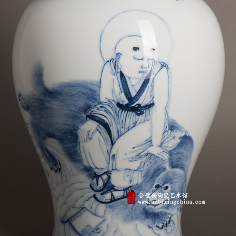 白瓷将军罐上,一位芒鞋坦臂的罗汉偏骑在瑞兽上穿云而行。传统的器型,传统的画面题材却让人眼前一亮。区别于青花画面传统的满构图,作者在画面中大量的留白,既为作品营造出强烈的空间感也让蓝与白的对比变得更加醒目。
