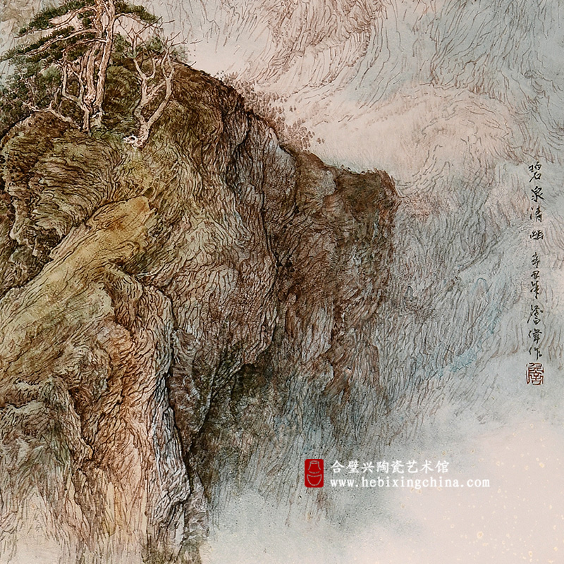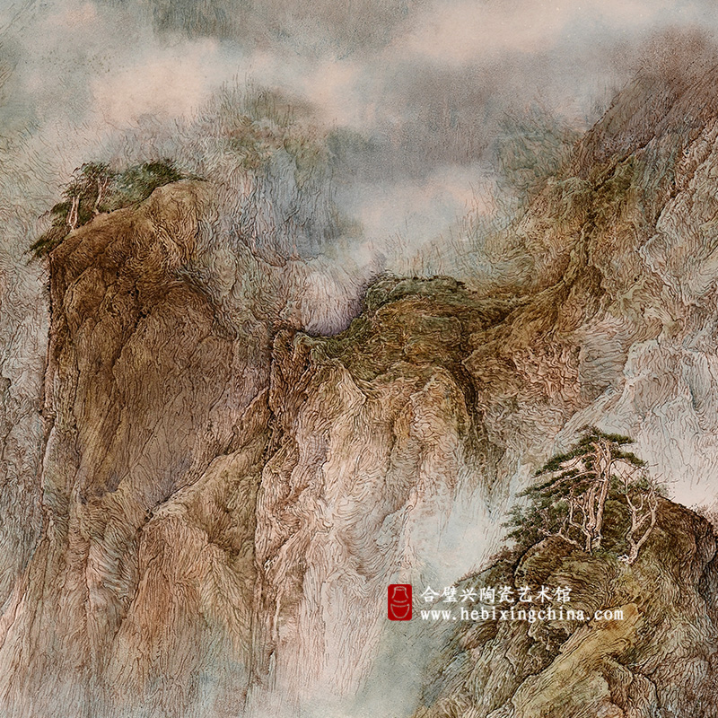 在突出陶瓷材质语言和绘画本体语言中寻求契合,把山石,树木,河川构入到由云气组成的空境中,形成虚实相生,空灵静谧的东方艺术意境!