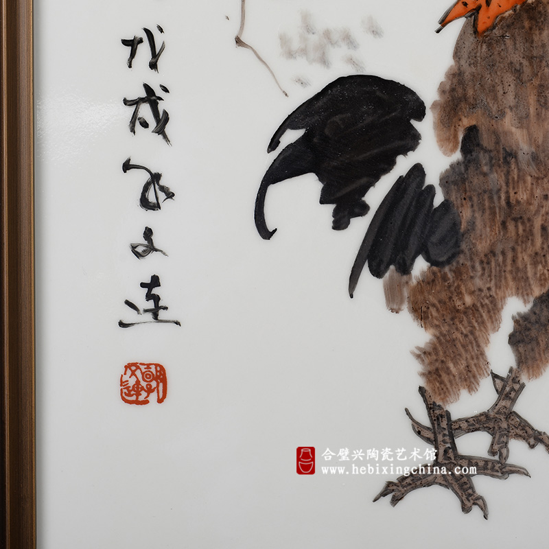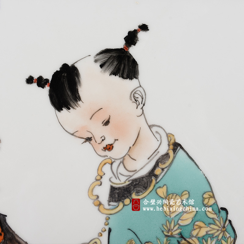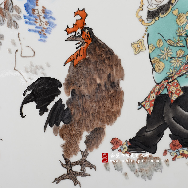 一旁,粉雕玉琢的小公子正悄悄地走到雄鸡的背后,翘起脚来给这昂首挺胸的雄鸡将军展示了一下脚下崭新的虎头鞋,雄鸡将军般的骄傲在孩童的顽皮和百兽之王的威武之下一扫而空,状作惊吓的表情滑稽中还透着几分可爱。