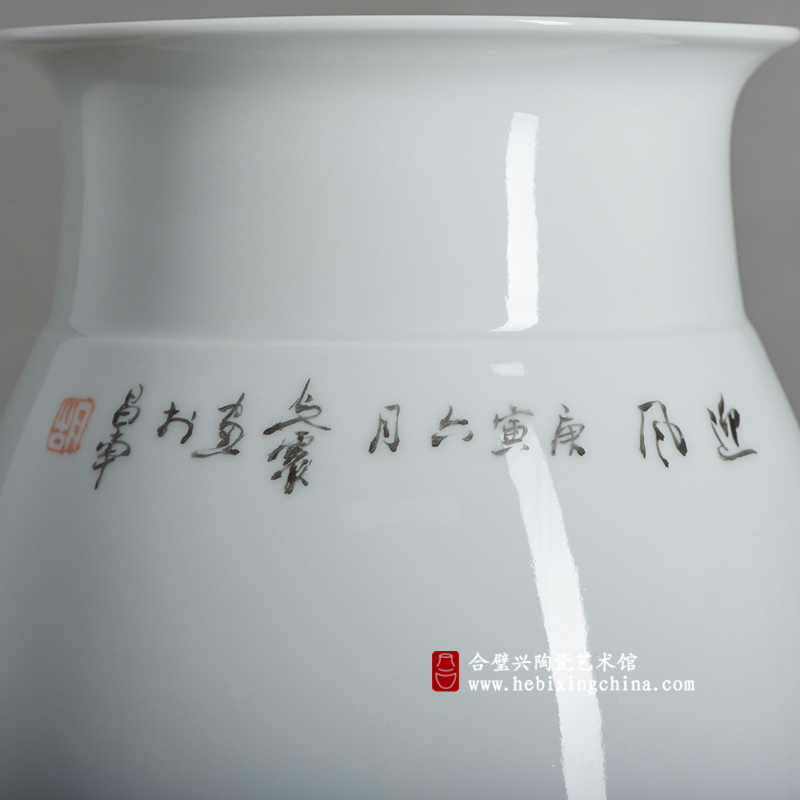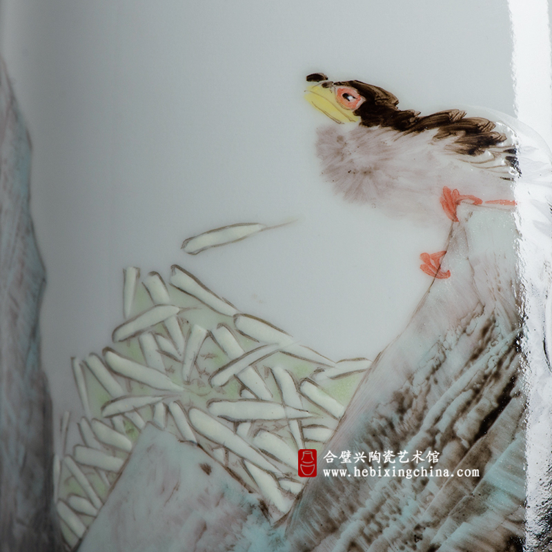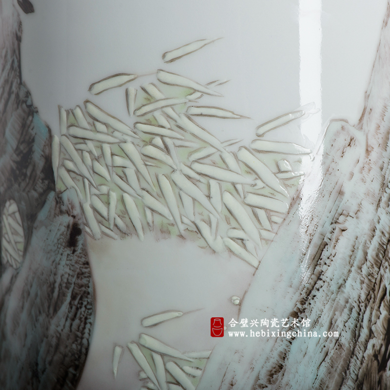胡光震老师充分利用了挺拔的瓶型所形成的高阔空间,用山石,翠竹,飞鸟巧妙安排出了一幅清新悦目的《迎风》图。