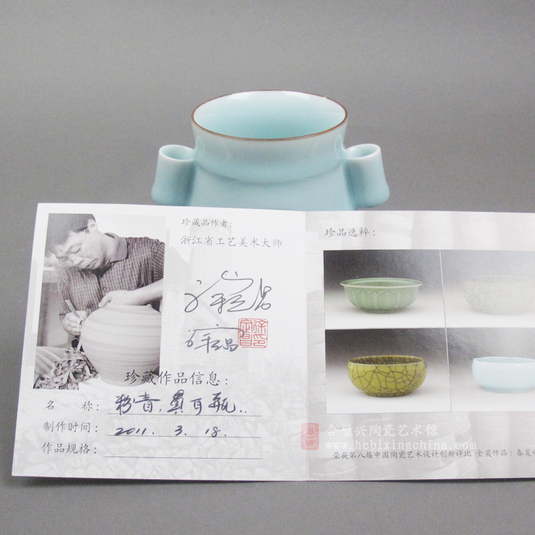 徐定昌1973年始从艺于龙泉上垟瓷厂,1996年建立龙泉市振昌瓷厂,40多年来孜孜追求青瓷艺术,不断吸聚传统精髓和探索现代艺术理念,集古今优异为一体,艺术创作精益求精,尤其擅长于全手工拉坯成型工艺。作品以薄胎厚釉的南宋官窑风格为主打,造型简洁大气、古朴典雅。多层施釉使器物釉色丰满,温润如玉。精湛的修坯工艺更使作品显得玲珑乖巧,令人百赏不厌。