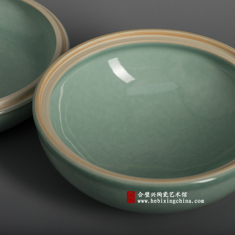 在传统文化中盒与合同音,因此被赋予和谐美满的寓意此件瓷盒内外通施雪里青釉盖和底以子母口相接扣合紧密整体呈规整的扁圆形有一种完满和谐的美感。
