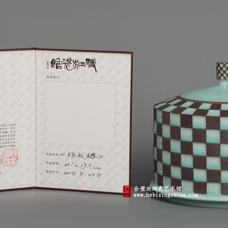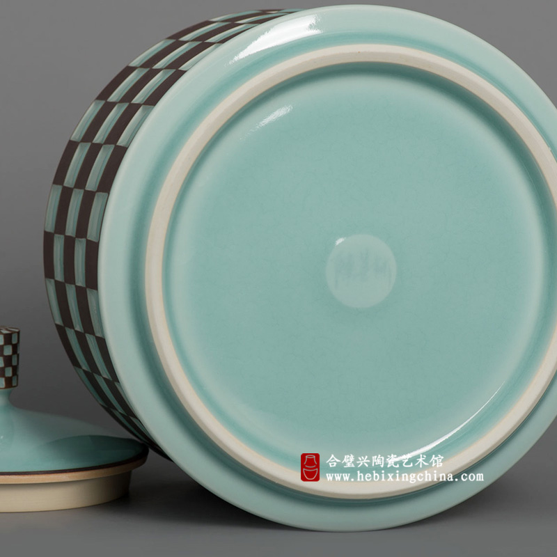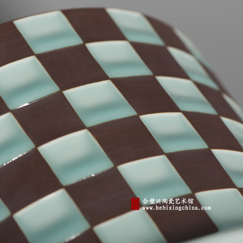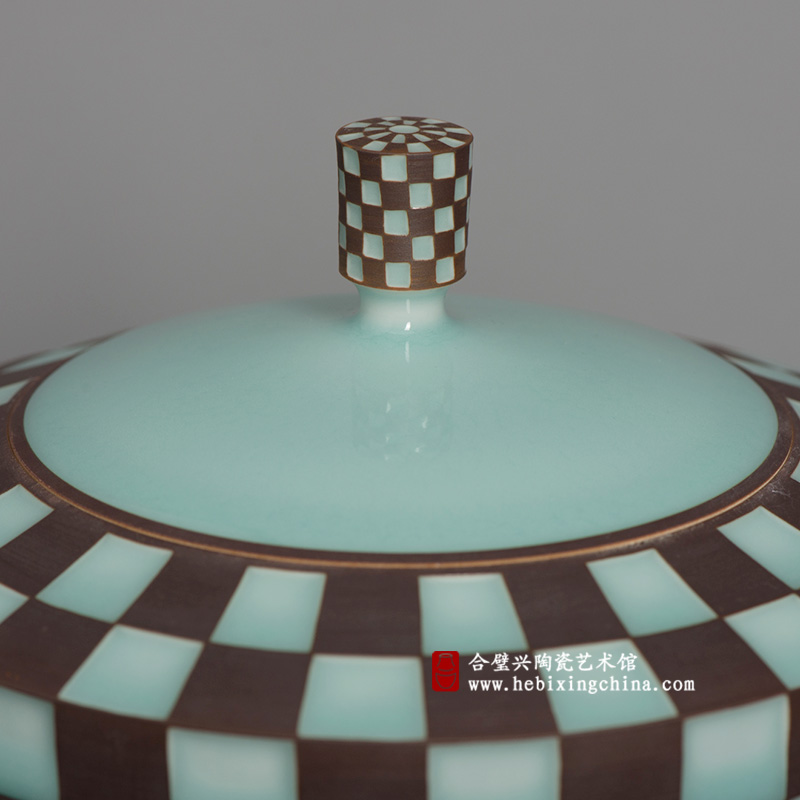 大面积的青色与紫金土、粉青釉方格交替,完美的呼应了罐身也让视觉再次产生了跳跃,把作品变得更加引人入胜。