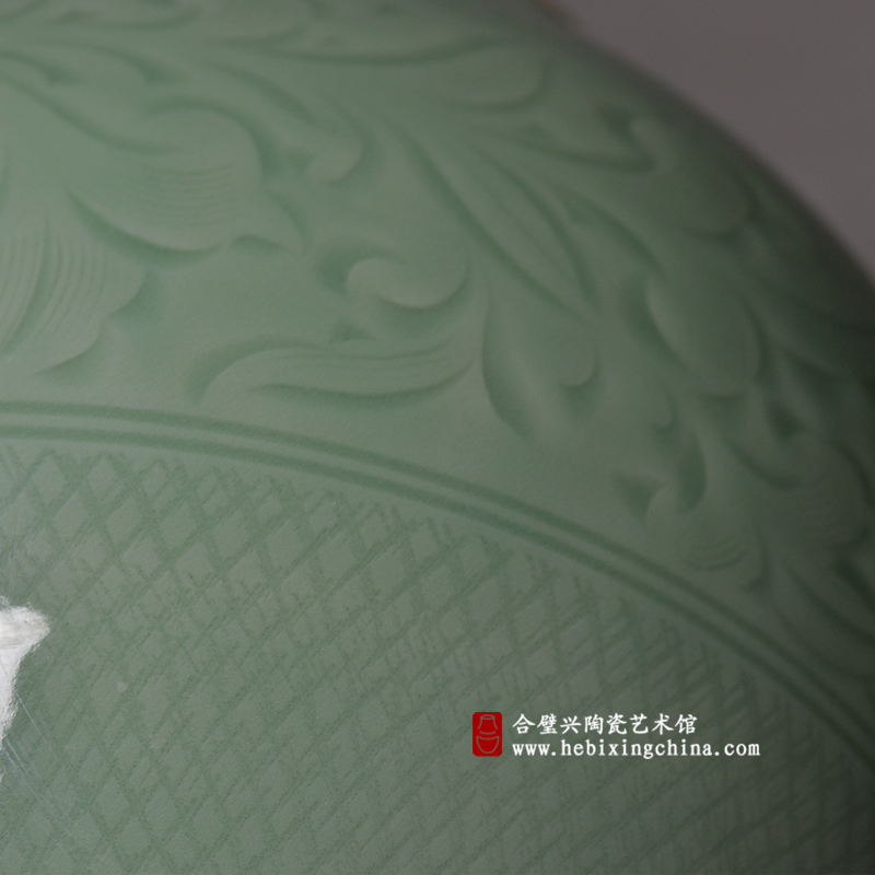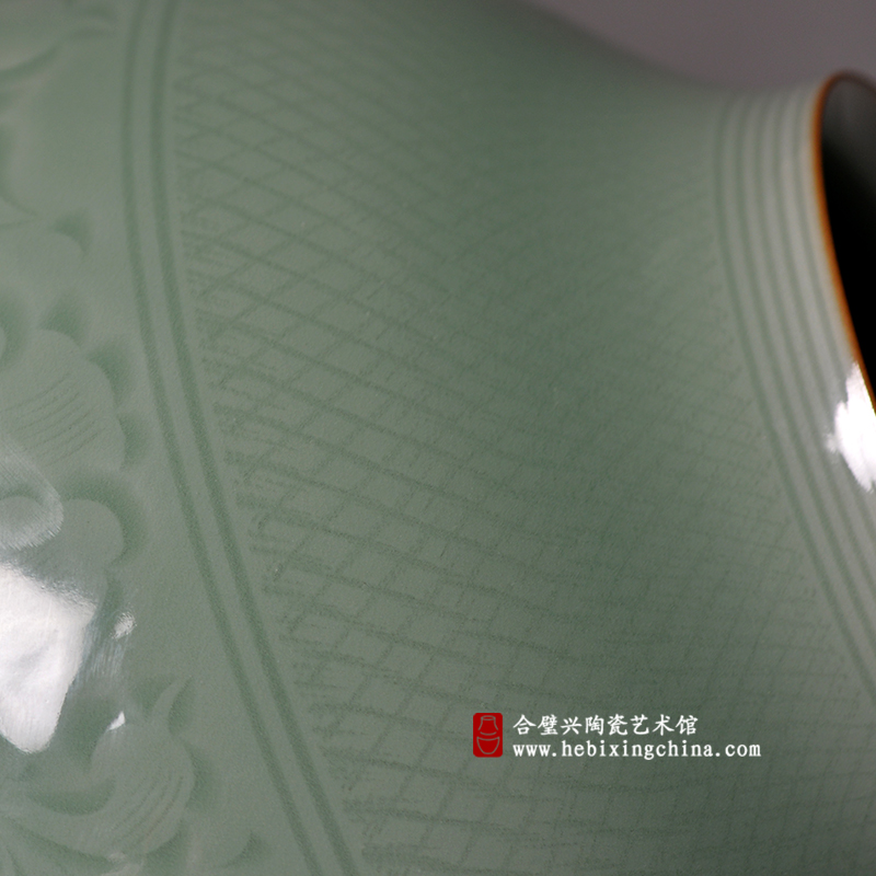胫之足的部分再以跳刀纹与上部呼应,增加了作品整体感的同时也让中部的牡丹纹饰在视觉上更加突出。陈爱明老师用跳刀纹与半刀泥的精彩组合充分的展示出龙泉青瓷的纹饰之美。