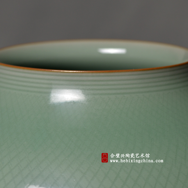 用三组弦纹在视觉上把罐面分成了三个区域,最上部的口沿及肩部用细密的跳到纹作为装饰,让细腻的梅子青釉在纹路中流动,产生自然的色彩变化;中间瓶腹的区域用半刀泥的手法刻画出几枝盛开的牡丹,刀法俊逸流畅,用大开大合的潇洒,把牡丹的雍容大气表现的淋漓尽致。