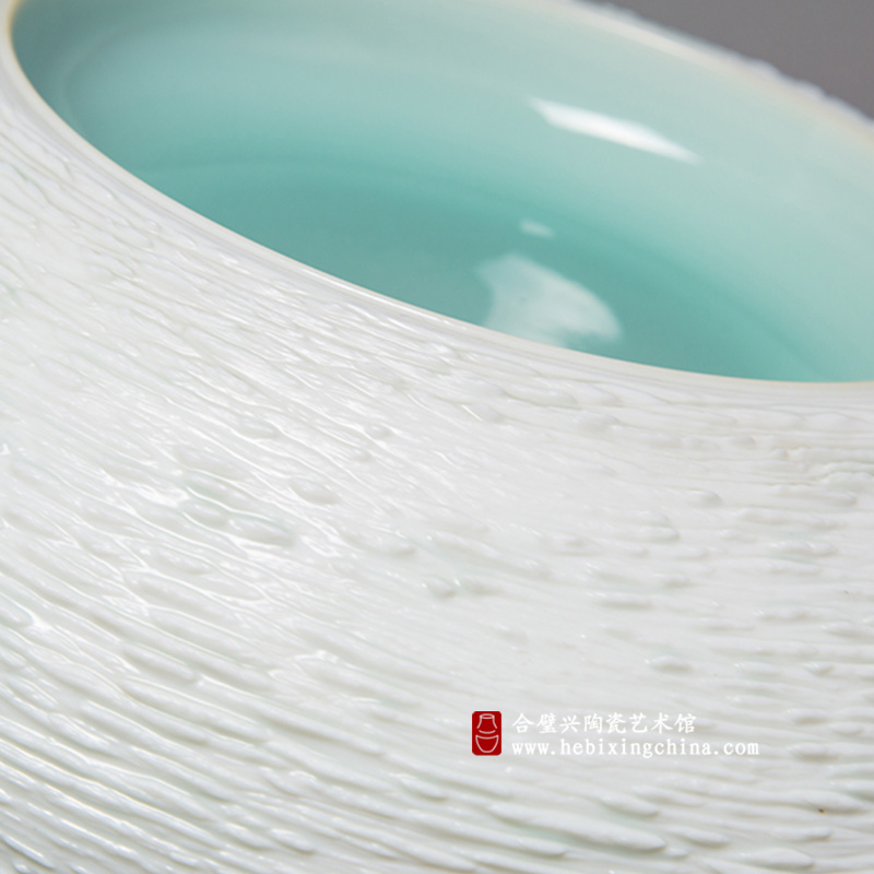 这件作品采用人双层拉坯的手法,弧线优美且圆润,青与白的色彩搭配让人心神舒畅。