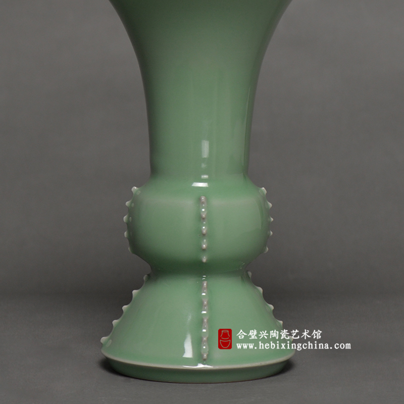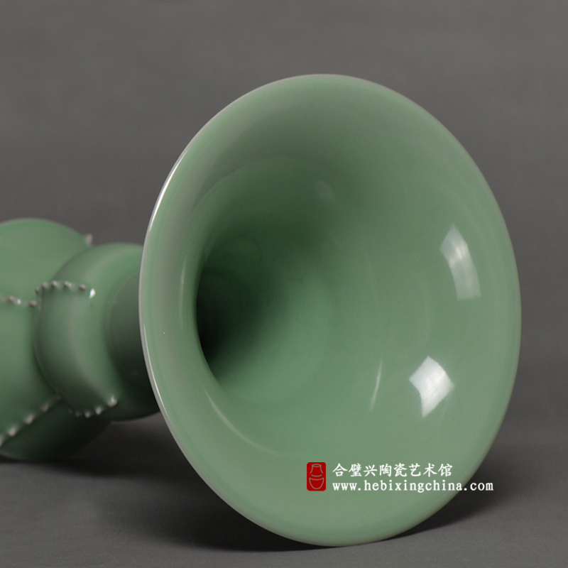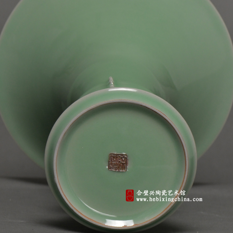 温润细腻的梅子青釉因为古朴的形制而显出沉静古朴的气质。作品底足处采用了二层台的式样,用翡翠质感的积釉展示出釉色的美好,也在不经意间向我们揭示出它“青瓷”的身份。