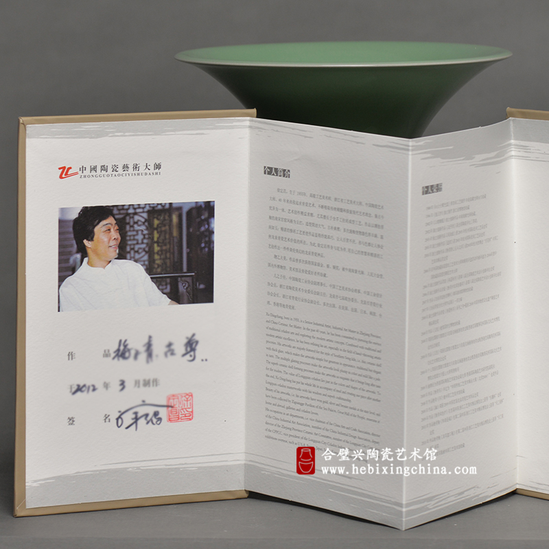 徐定昌1973年始从艺于龙泉上垟瓷厂,1996年建立龙泉市振昌瓷厂,40多年来孜孜追求青瓷艺术,不断吸聚传统精髓和探索现代艺术理念,集古今优异为一体,艺术创作精益求精,尤其擅长于全手工拉坯成型工艺。作品以薄胎厚釉的南宋官窑风格为主打,造型简洁大气、古朴典雅。多层施釉使器物釉色丰满,温润如玉。精湛的修坯工艺更使作品显得玲珑乖巧,令人百赏不厌。