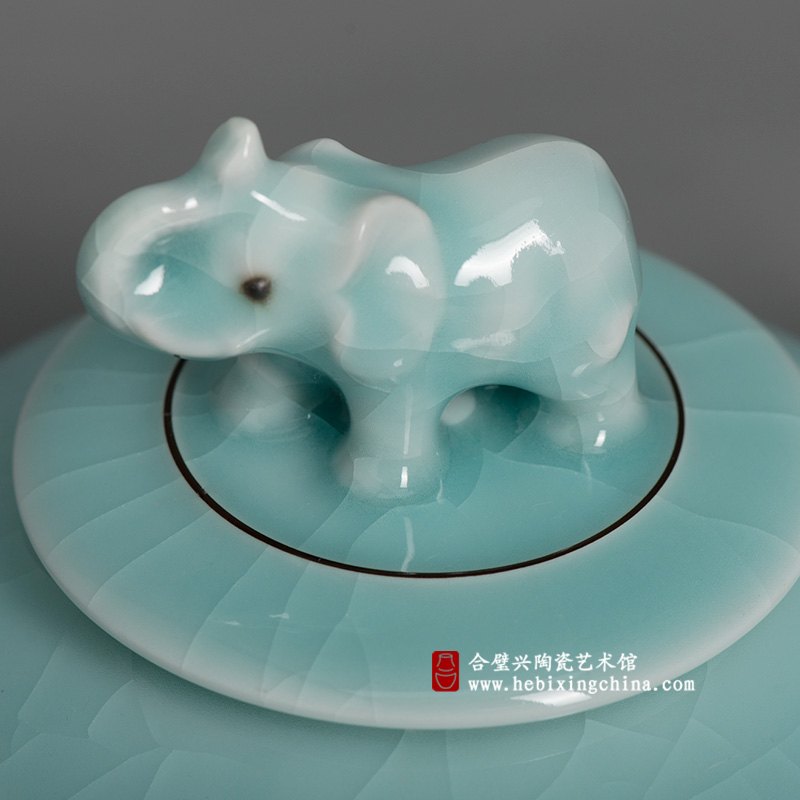 盖顶一头小象憨态可掬,黑色眼睛灵动可爱,长鼻高高扬起,仿佛正站在清澈的溪水中玩耍,茶壶因为这头可爱的小象而显得灵动有趣生气勃勃。