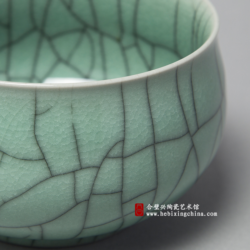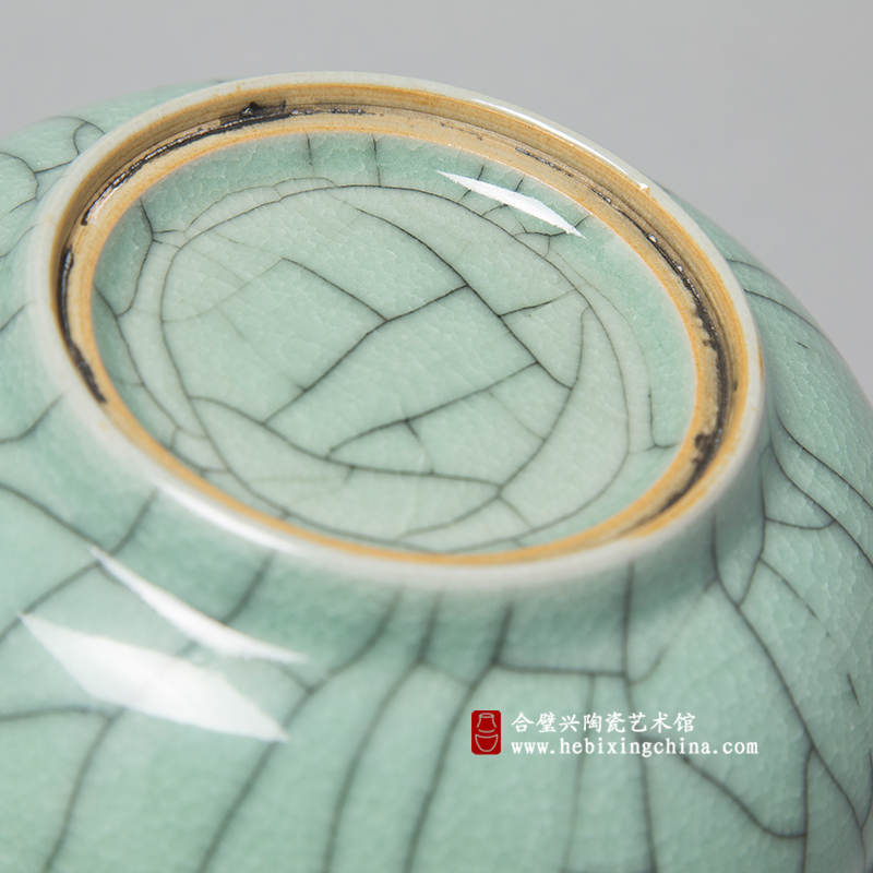 两种不同风格的开片在如玉的梅子青釉层中奇异的和谐共生,连墨色铁线中带着的几分西方式的抽象美感,也和谐的融入到极具东方含蓄审美的清润釉色中。