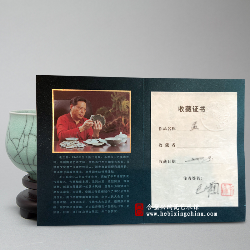 毛正聪从事青瓷艺术研究60多年,作品在继承传统工艺基础上大胆创新,造型简洁大方、典雅大气、釉层丰满,温润如玉。哥窑象形开片千奇百态,既象非象,别具一格,创当代青瓷最高境界。作为越系青瓷技艺史海钩沉的大家,毛正聪大师已致力恢复了仿官釉、鱼籽纹等多项失传技艺,为中国陶瓷事业继往开来做出了卓越贡献。