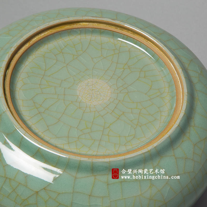 随机性极强的开片在这里仿若被人工驯服了一般在釉面上均匀而舒展的伸延,不着痕迹的融入在清润醇厚的釉色里,于是自然之美与手作之美交融在一处,达到一种“天然造化尽如人意”的玄妙境界,引领着观者用心体味其中蕴含的美丽与真意,并深深为之陶醉。
