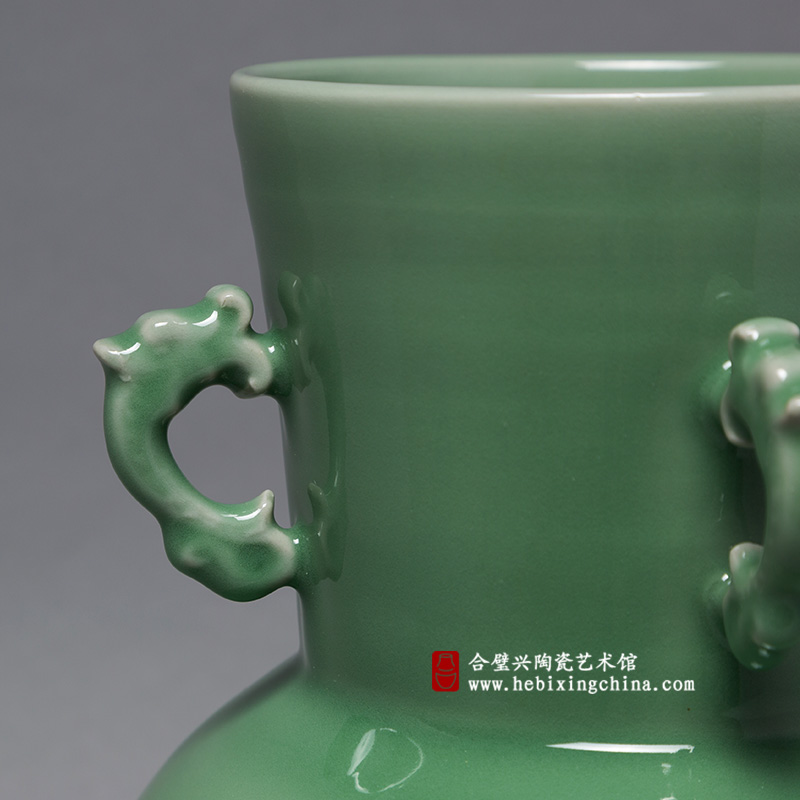 青瓷的质感让龙的形象显出玉雕般美好的灵秀气质,丰厚的梅子青釉更是为龙耳染上了翡翠般的颜色。