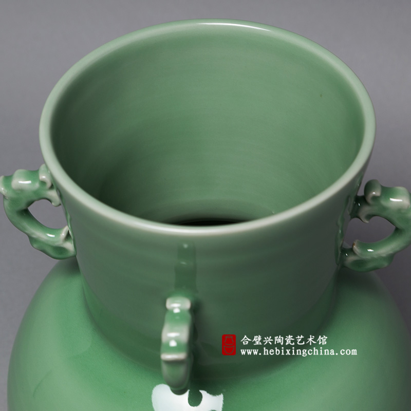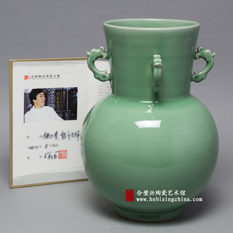 直口,粗颈,圆腑,圈足的造型在大开大合中透出些许青铜器的霸气,浑圆饱满的腹部呈现出吉祥圆满的意象,颈上的四只龙形小耳更是恰到好处的点出了“龙年”的主题。
