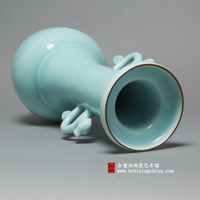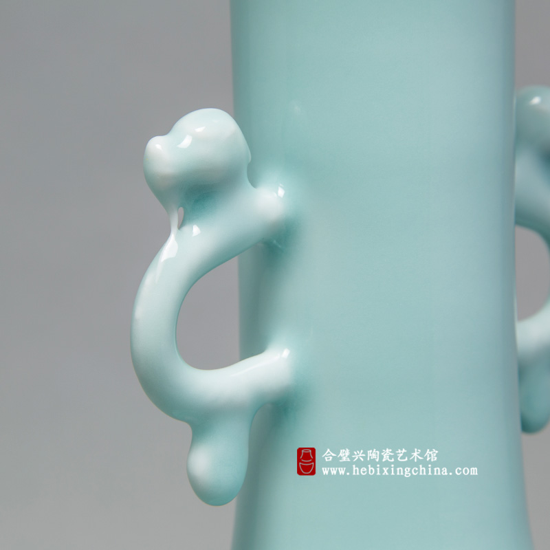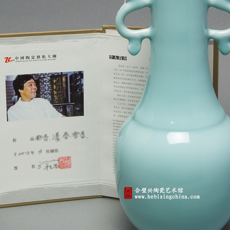 众所周知,青瓷作品要经过1300度的高温试炼才能呈现出完美的釉色,而瓷胎在高温中极易产生断裂和变形。这件作品修长规整的颈部和优美的龙耳让我们不得不叹服于徐定昌老师高超的制瓷技艺。