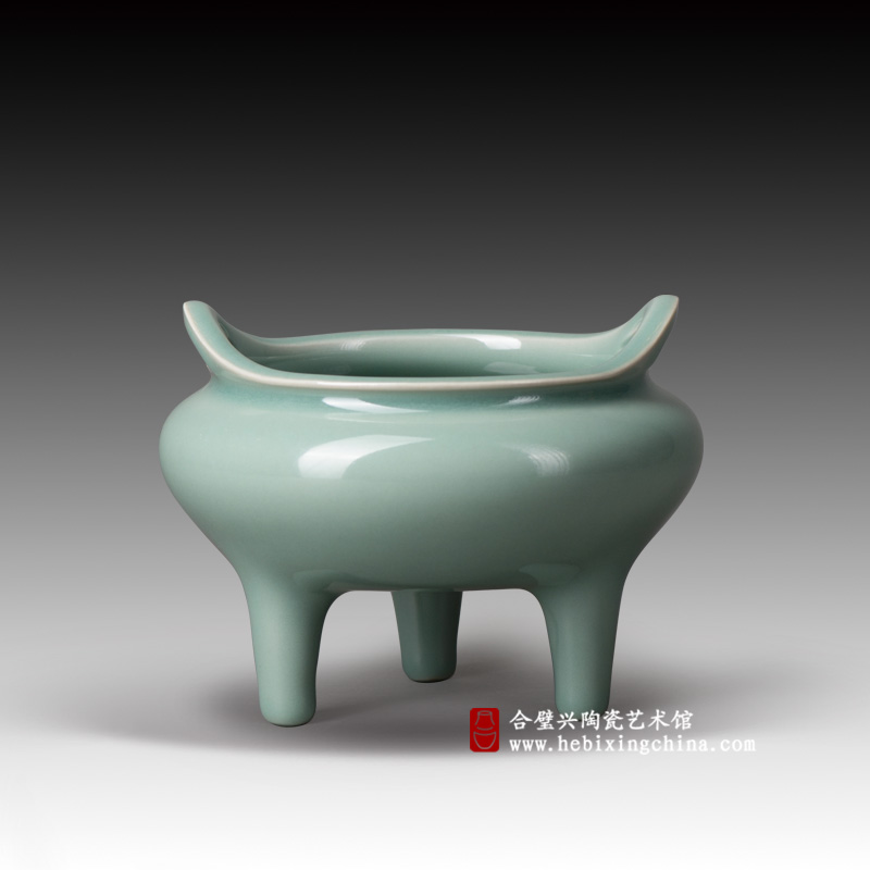 束口,肩部微微下溜,腹部扁圆,腹下三组,线条饱满灵动,唇上双耳与炉身浑然一体,镂空处两脚略略成尖,形似凤目,整体造型一气呵成,非常舒服。清雅的如玉梅子青釉如同刚刚沐浴了江南的春雨,清新而悦目,经典的形制被醉人的釉色染上了温润秀雅的气质。