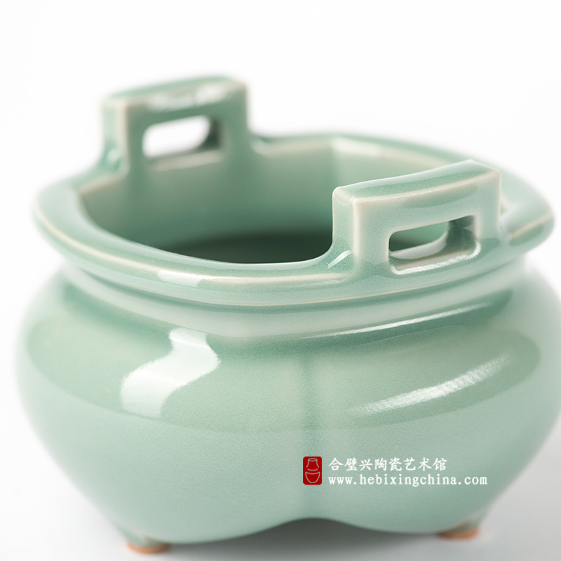从上而下望去,棱角分明的炉耳与口唇端正中带着弧度,就像是举止端方,处事圆融的青年学子;从下往上观之,底足处的朱砂胎自然呈现出丹红色与纯净清透的梅子青釉相衬非常讨喜,把小小的香炉点缀的温柔又俏皮,就像是明媚可爱的邻家小姑娘,红润的脸上满是甜甜的笑容。