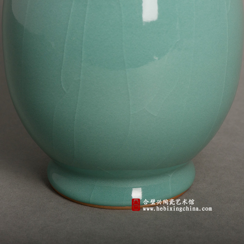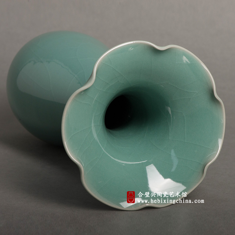 雅致的梅子青釉散发着翠玉般的温润光泽,丰厚的釉水流动间在口沿处形成了自然的色彩渐变,微微的露白仿佛为碧色的花朵镶上了白色的细边,愈发的雅致悦目。细细端详,细腻的釉面上还有疏密有致的开片,像是自然伸展的筋脉,为这朵清新典雅的朝颜再添几分脱俗的风骨。