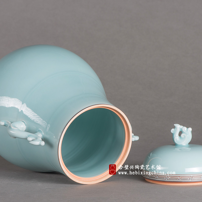 卢伟孙老师的粉青釉清雅明净总能让人从中感受到坦荡疏阔的君子之风。规整的紫色回纹装饰古朴雅致,仿佛一条精致的绢带把我们牵引回玉堂金门的汉代;优美的凤耳、玲珑的凰钮为我们缓缓打开了司马相如与卓文君那“凤飞翱翔兮,四海求凰”的千古传奇。