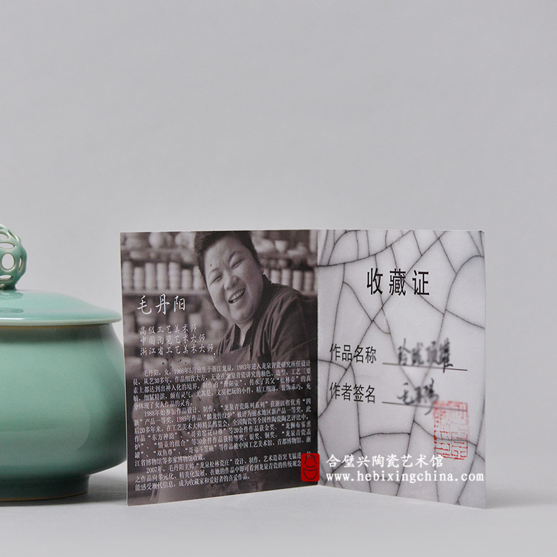 毛丹阳系青瓷名家毛松林大师长女,其作品极富女性内涵韵味,注重细节,构思奇妙,手工细腻,既有传统文人气又富有现代装饰感,个性鲜明,生活气息十足,带给人们艺术和美的享受。毛丹阳把雕塑技巧充分运用到青瓷装饰上,那些含蓄、细腻、富于变化的线条和那些生动鲜活、舒展饱满、刚柔兼备的装饰图案,让这个沉静清雅的青瓷世界多了许多动感。作品多次参加全国工艺美术精品展览并获奖,深受喜爱,被国内外馆藏机构和陶瓷爱好者广为收藏。
