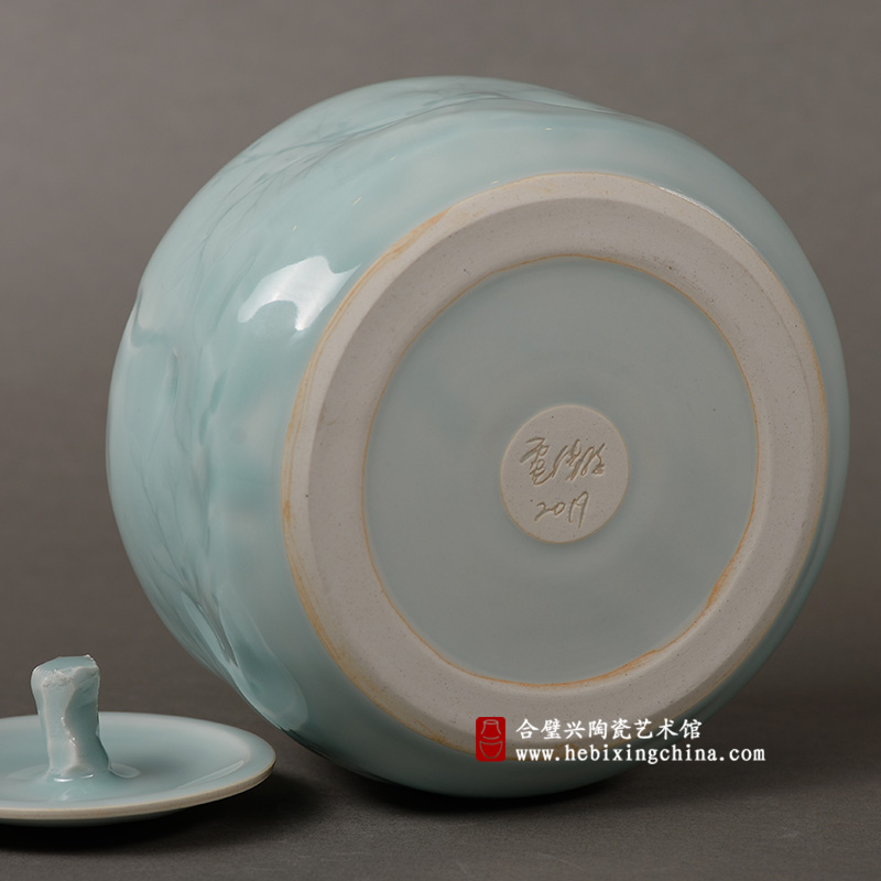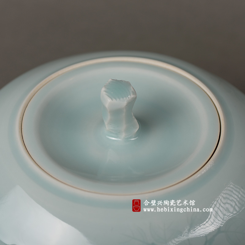 有别于传统器型的规整,这件作品的表面有着不规则的凹凸,盖钮也做随型处理,在造型上隐去了人工的痕迹,呈现出岩石一般浑然天成的质朴状态。把茅舍村树,山水田园刻入自然凹凸的表面,再覆上如青雾般清朗沁人的粉青釉色,清新质朴的田园风景带着山水诗词特有的隽永韵味迎面而来。