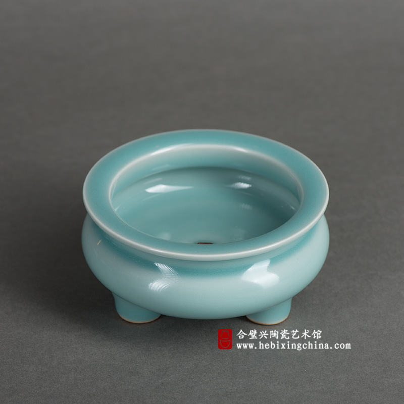 香炉在传统青铜三足炉的形制上又有变化,颈部内束口沿外展,腹部线条饱满圆润,腹下三足比例匀称,整体造型敦实可爱。小巧的体量既可以陈设在案头,又可以上手把玩,是青瓷小器中难得的佳品。