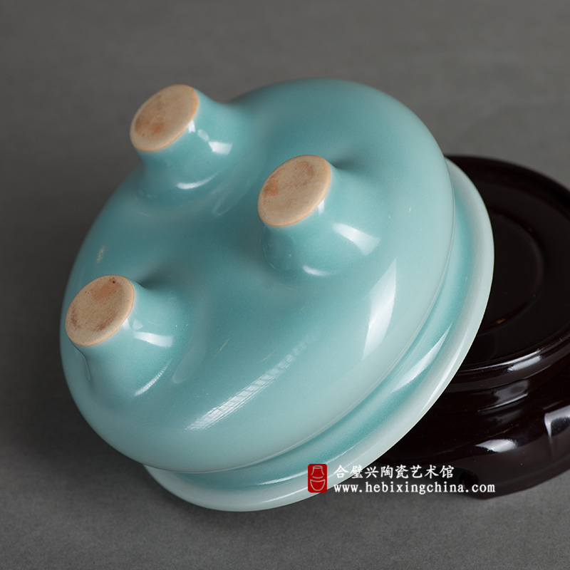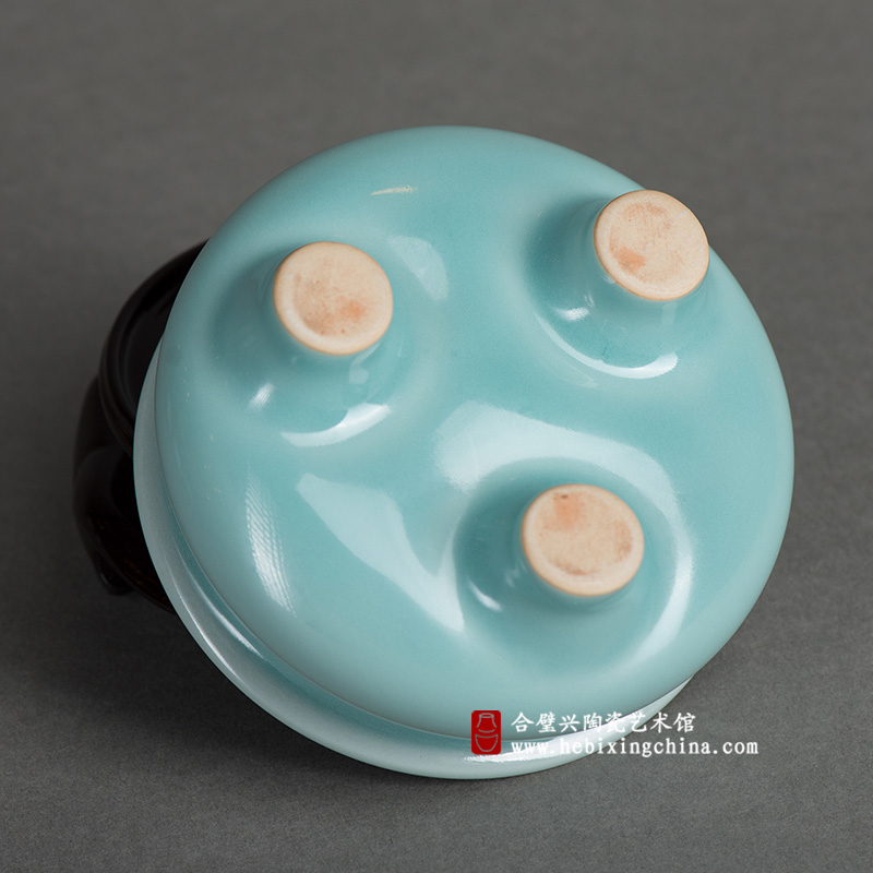 这是周华老师的一件青瓷小品,清润的釉色让圆润的小香炉显得更加丰润可人。口唇上的一圈积釉薄厚适中,既体现出青釉丰润如玉的美感又不会因为过于厚实而失了轻灵。釉面细腻清润光亮如镜,炉内中心处周华老师的紫色款识在莹润的青釉中显得格外精致。