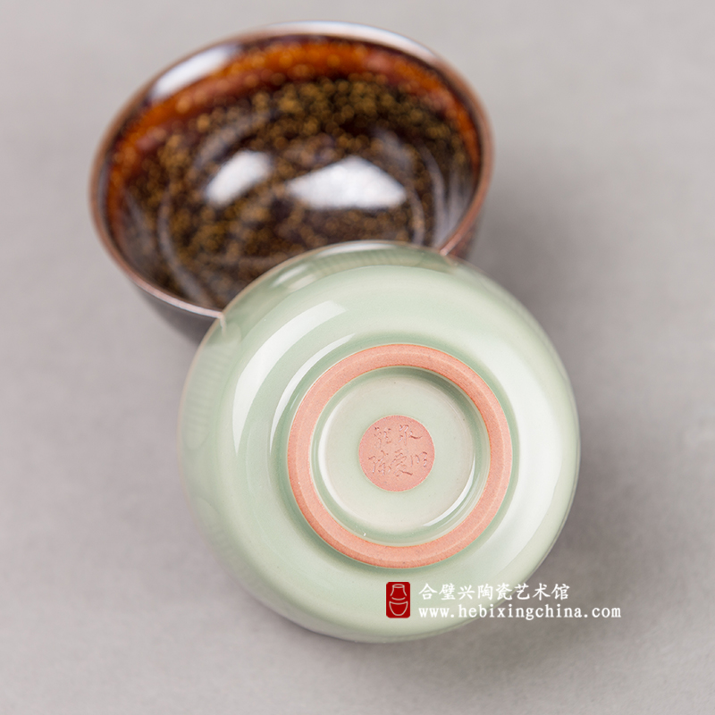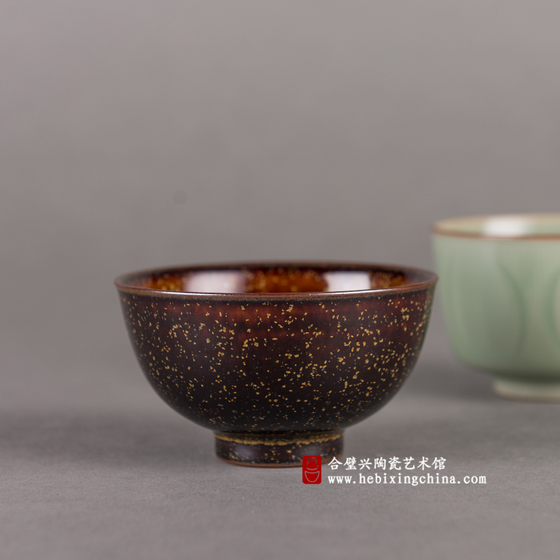 光亮如鉴的釉面有一种特别的半透明感,蜜样的迷人,红酒般的醇厚,点点碎金浸在其中,悠远古朴似天上繁星。如果不是手中的重量提醒真会让人错觉:此刻捧在手中光亮古朴的茶盏是一件流传有序的精美漆器。
