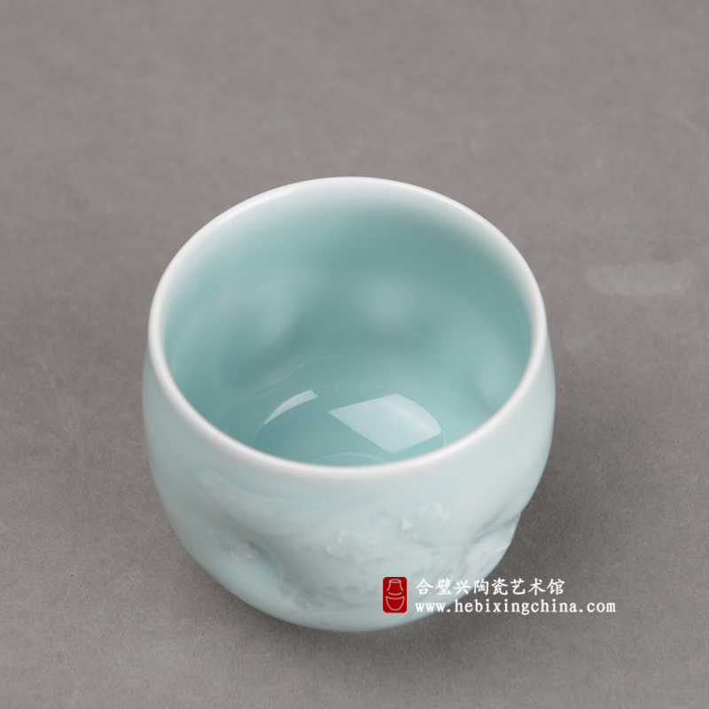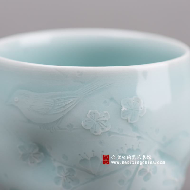 这一次卢伟孙老师却用独具个性的装饰手法和潇洒传神的刀工把登梅的喜鹊嵌入到山水画的清幽意境中,用明朗典雅的粉青釉色洗祛了俗艳的色彩,为喜鹊登梅这个传统的题材注入了清新文雅的新气息。典雅而喜庆,吉祥而潇洒的独特气质让这件作品成为了茶桌上的君子,书案上的宠儿,为静雅的生活再填一抹欢动的喜悦。