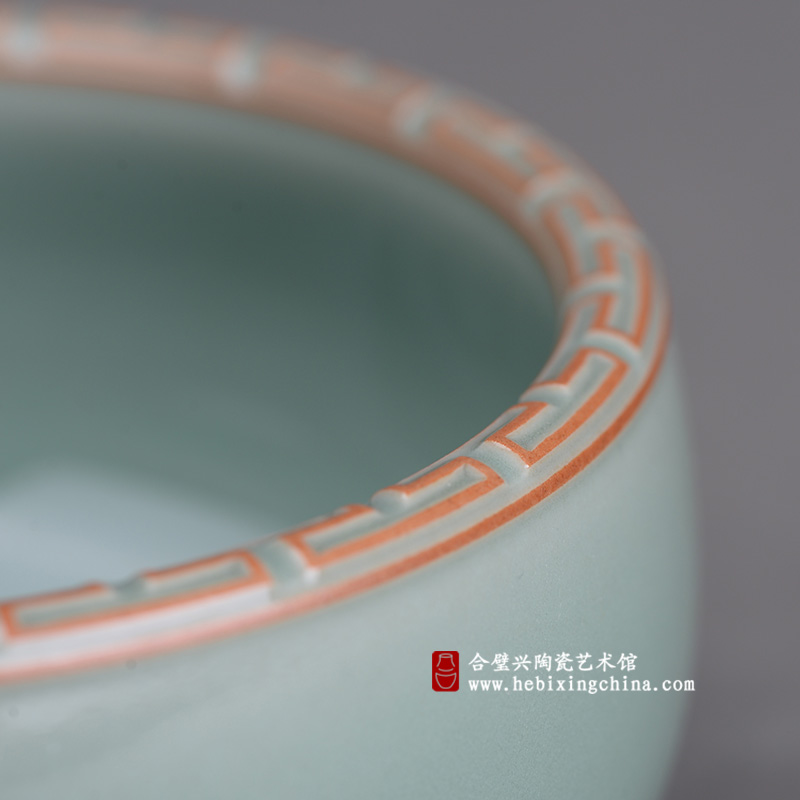 古朴典雅的回纹因其连绵不断,往复回环的特点,在我们的传统语汇有非常吉祥寓意。王传斌老师巧妙的将他的祝福融合到了青瓷作品中,藏友们福寿连绵,吉庆永长。