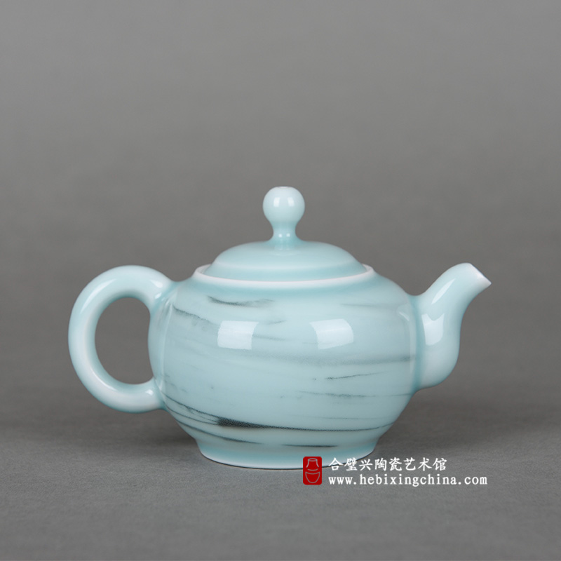 在丰润的粉青釉面中盘旋着绞胎形成的墨绿痕迹,自然舒展的线条像极了上好翡翠中天然浮现的纹路,时而不在表面,时而隐在其中,轻轻旋转壶身,那纹路又变成了点入清池的翠墨随着水波晕散出的美丽涟漪,虚实变化中蕴含着自然的玄妙和水墨画般的潇洒情韵,让人忍不住想将它捧在手中细细赏玩。